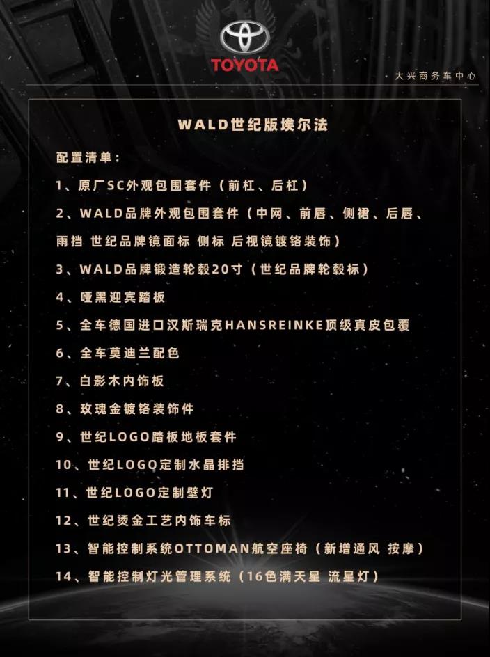 大兴商务车中心迎来大兴丰田一年一度丰田埃尔法、威尔法定制升级的盛会,届时你将会看到很多不一样的个性升级方案,可以了解到关于丰田埃尔法、威尔法的所有升级套件的展示,还有各种专属定制方案。